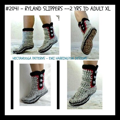 crochet pattern RYLAND slippers, 2 yrs to adult XL (13- 14 inch foot) Easy pattern, work up quickly using 2 strands of worsted weight, or one strand of chunky yarn. Unisex style Great Christmas gift idea! . CLICK here to see all my CROCHET SLIPPER PATTERNS: http://www.ravelry.com/patterns/search#sort=best&quer...HARRINGTON%2C CROCHET SLIPPERS . CLICK HERE to enter my Ravelry pattern store: http://www.ravelry.com/designers/emi-harrington .