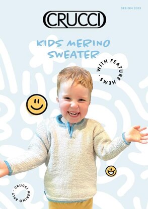 Knitting pattern for a kids merino sweater with feature hem. Uses CRUCCI 8ply Merino Wool. Intermediate skill level required. Comes in kids sizes 2-12.