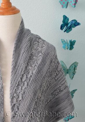 The shawl's asymmetrical shape begins with a tapered end with twice as many increases on one edge as there are decreases on the other. The shaping is easily learned and followed throughout.