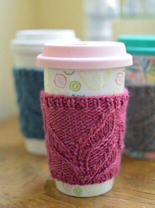 Knit up one of these useful and pretty little coffee sleeves in just a few hours with very little yarn. The leaf design is charted and written out and mostly consists of simple 2-stitch cable twists.