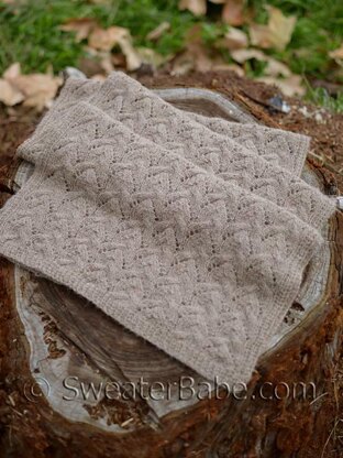 The beautifully textured stitch pattern is surprisingly simple, with easy cable twists alternated with a very repetitive lace motif. The edges are all knit in and worked in a simple ribbing with twisted stitches worked on the wrong side.