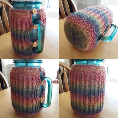This is a great project if you love to drink out of glass but hate dealing with all the sweating. I have used these kinds of insulators for 2 years. They work great for keeping water colder longer and reduce watery messes. You can reduce the size to a pint if you felt the project. I used the 3/8" gauge x loom but I also have written for regular 60 peg loom version in the same gauge. There is a video tutorial for the x loom version but written for the regular round 60 peg 3/8" loom version. This is also a great project for some scrap worsted yarn. You will need 3 to 4 buttons and if you are doing the round loom version you will need a thin elastic to put through the cast on.