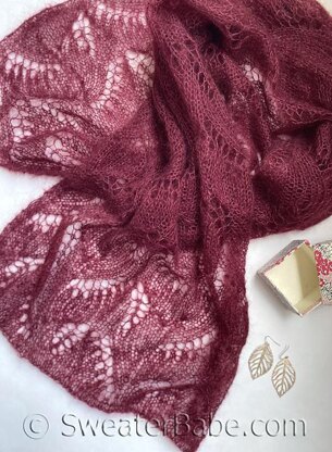 Paired leaves branch out in different directions along the length of this rectangular shawl. Double eyelets follow the delicate arch of each leaf.