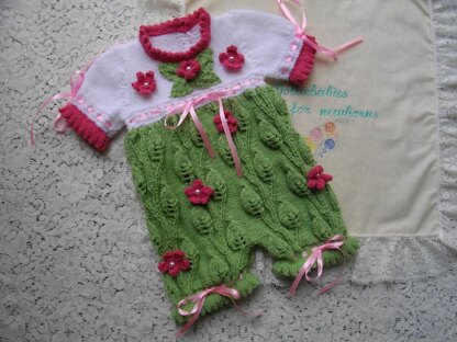 Instructions for a baby or reborn doll's romper suit with a leaf pattern, knitted leaves and flowers. There is a matching sun hat with a large brim, which covers the back of babies neck and shoulders, and the most adorable sandals. When knitted this set will fit a 21-22 inch reborn, 19-20 inch reborn, 17-18 inch reborn or a 15-16" reborn, or babies 2.5lb through to 3 months.
