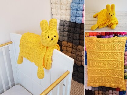 This is a crochet corner to corner (c2c) baby blanket that combines regular c2c crochet with bobble stitches to create a love message on the blanket reading No Bunny Loves You Like I Do.