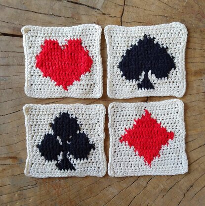 Easy to follow 4 crochet patterns of 10x10cm/4x4" squares with playing cards symbols: heart, diamond, club and spade. Use very small amounts of DK yarn (10g for each square!) to create unique squares, that you can combine with other square motif and make crochet design of your dreams. There's a chart and row by row stitch count for each square.