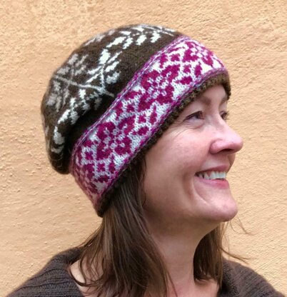 The facing is folded over a yarn over rnd, that is very decorative. The hat also has a couple of Latvian braids for décor purposes. Both the bottom and the main part of the hat has fair isle pattern. This is both decorative, and it adds extra warmth.