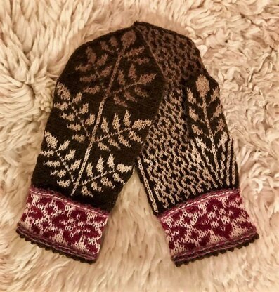 The mittens have a yarn over rnd at the wrists, that is very decorative. They also has a couple of Latvian braids for décor purposes. Both the bottom and the main part has fair isle pattern. This is both decorative, and it adds extra warmth.