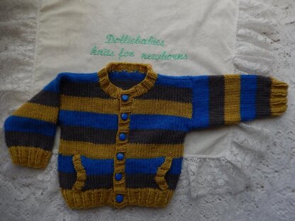 Instructions for a baby or reborn boy doll's cardigan with pockets in either 4ply or DK yarn depending on size. This cardigan will fit either babies 2.5lb -0/3 months or 21-22 inch reborns, 19-20 inch reborns, 17-18 inch reborns or a 15-16" reborns. You will need 50g 4ply or double knitting yarn in main colour, 50g contrast colour B, 50g contrast colour C, either 2.75mm, 3.25, 3.75mm and 4mm needles, and 6 buttons, plus a couple of stitch holders.
