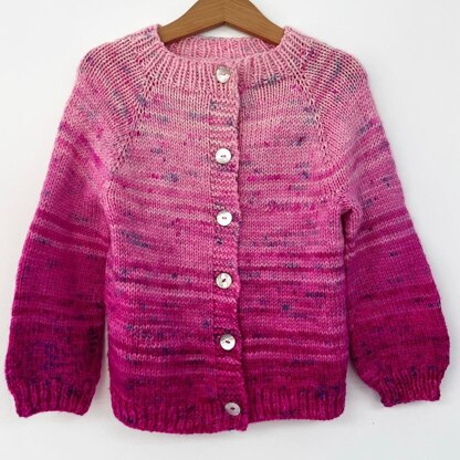 The armholes are shaped with raglan increases, after which stitches are set aside for the sleeves to be knit later. The body is then completed with a ribbed edge. Finally, the sleeves are knit in the round and finished with a ribbed edge. There is a worksheet provided with instructions on how to fade the colours to help you plan your garment. Yardage for each of the 5 colours has also been provided. Get creative with your yarn choices. You can choose colours that go from light to dark or dark to light or just fade together yarns that make you happy. This is also a great pattern to stash bust your existing yarn. The model in the picture wears the 4-6 year old cardigan and has a chest measurement of 61cm / 24 in.