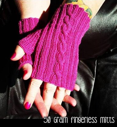 These mitts are so named because they require just 50 grams of sock yarn. Most sock yarns come in 50 or 100 gram skeins. So depending on which size you have... you can get one or two pairs from your skein! So often I end up with a 50 gram hank of sock yarn... mostly because I buy random yarns that I am attracted to, with no project in mind for it. Now I have a project I can use them for... and the results won't be hidden in my shoes, but right here on my hands.