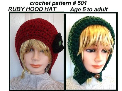 RUBY HOOD HAT, WITH OPTIONAL BUTTON CLOSURE, OR TIES. (Or this hat can be made without any closure at all.)