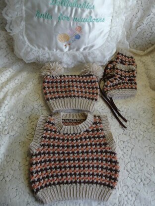 A boy’s round neck tank top, with matching tea bag hat and bootees.