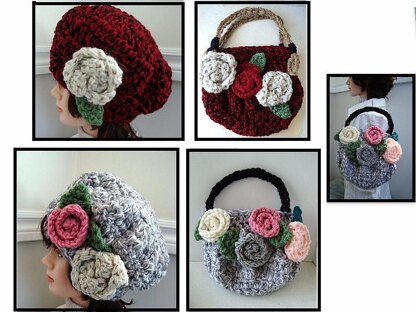 CROCHET PATTERN FOR a Beret Hat and Matching Bag with flowers, CROCHET PATTERN, Women's size hat, winter accessories, digital download pdf handmade. New pattern from: https://www.etsy.com/shop/HatAndScarfPatterns THIS IS A DIGITAL DOWNLOAD PATTERN, NOT THE FINISHED ITEMS.