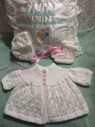 A cute little yoked matinee outfit for a premature to 3 month old baby, or 15 -22" reborn doll. The set comprises of an old fashioned style matinee set, but with a yoke that is knitted sideways. There is very little sewing up for this set, as it the main body is knitted in one piece, so that just leaves the sleeve seams and the front bands to be sewn together. There is also a matching bonnet for the girls, or beanie hat for the boys, and matching bootees.
