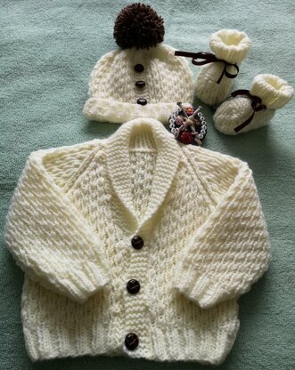 A really cute puff stitch knitting pattern for a boys shawl collared cardigan with matching bobble hat and bootees. The pattern is in sizes 3lb - 3 months for babies or 15-22" reborn dolls. I have used Sirdar Snuggly DK.