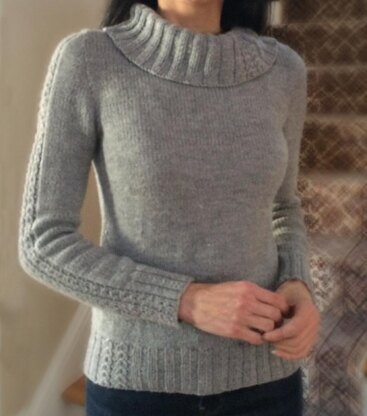 Worked seamlessly from the Top-Down and almost entirely in the round, the set-in sleeves of the pullover are created simultaneously with the upper bodice in a technique originally described by Barbara Walker (a photo tutorial is included in the pattern). Mini faux-cables accent the cowl neck and hem, and run along the length of the set-in sleeves.