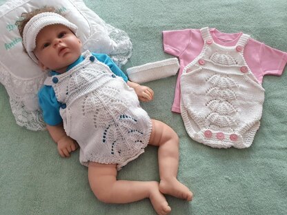 Instructions for a reborn or baby dungaree romper. The set comprises of a dungaree romper that fastens at the top, sides and underneath, and a pull on sun visor. This is a really quick knit and easier than it looks to do.