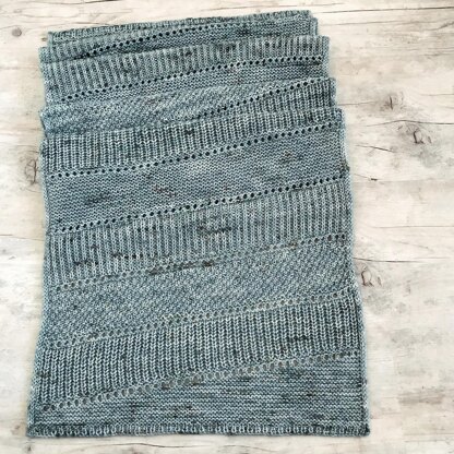 Using stitch patterns based on my 'Rocas' shawl, this rectangular scarf with crisp i-cord edges features graphic diagonal lines created by short rows and eyelets between easy-to-knit panels of different stitch combinations. This construction lends itself well to the use of tonal or speckled yarns but would also be striking in a solid color.