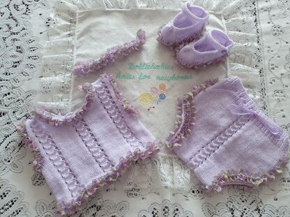 Instructions for a cute little vest, knickers, Mary Jane shoes, and a headband. The vest, shoes and headband have instructions with and without knitting in lace. There is the choice of knickers with knitting in lace, or fully patterned knickers without lace.