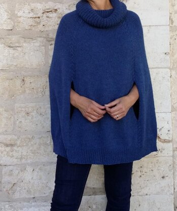 The cape is knit in the round from the top down, beginning with the cowl. The cowl neck is worked in a half brioche rib stitch, followed by a k1, p1 rib. Increases for the cape are made on either side of the cables. The armholes are created by working the front and body pieces separately as flat pieces.