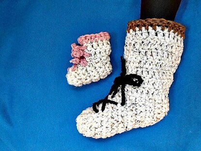 Snow Boots Booties and Slippers, all sizes from Newborn to Adult Large. Easy pattern to follow, includes a video link as well as written instructions.