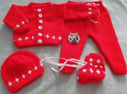 A lovely, quick and easy pattern for a unisex round neck cardigan with matching leggings, beanie hat and bootees. The cardigan, hat and bootees feature a 'North Star' pattern on them. There are no charts to follow, it is a fully written pattern, and is ideal for using up some of those oddments for the stars, that you don't quite know what to do with.