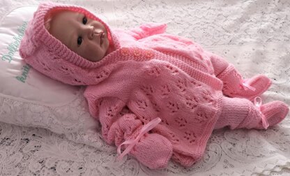 The first of 2 customer requested patterns. This one is for a 4 piece hooded pram set with a lovely pine tree lace pattern. The set consists of a hooded matinee jacket, mittens, plain leggings and patterned bootees. This set is also unisex. You can knit the whole set before you know the gender of the baby, and you just need to sew the button/buttonhole border on with the buttonholes on the side needed once you do you know the gender.