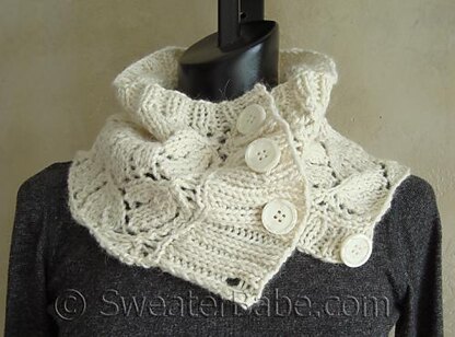 Two beautiful, open, lacy stitch patterns combine to create a unique cowl and makes for interesting knitting. An angled button band allows you to wear the cowl many different ways. Keep it open by only using 1 or 2 buttons and wear it like a soft scarf/collar. Button 3 or 4 buttons to wear it as a stylish cowl.