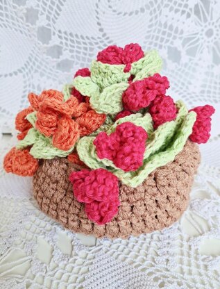 This is a lovely home decor. Flower-kissed coasters set in a basket. When not in use, you can keep them in the basket as decoration. What you get with this listing? Pattern for the coasters, basket and 2 types of roses. Supplies: *sport yarn in colors of your choice and a 3mm hook for the coasters and flowers, and DK yarn / 4 mm hook for the basket. * tapestry needle for weaving ends, and scissors. Stitches: chain (ch), chain space (ch-sp), skip (sk), slip stitch (sl st), single crochet (sc), half double crochet (hdc), double crochet (dc), dc2tog, treble (tr). American terminology used. Measurements of finished coaster: 15 x 15 cm or 5.9 x 5.9” (at the widest point including leaves on each side) Measurements of finished basket: bottom 13cm/5,11”; diameter at the top when finished: 9,5 cm/3.74”
