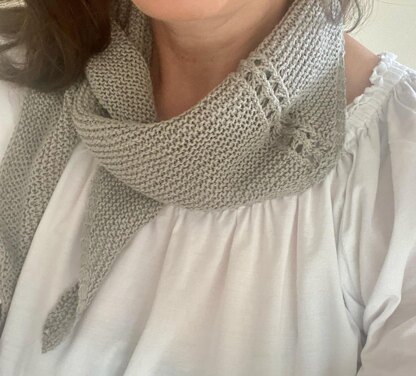 Ideal for beginners, garter stitch and a simple lace pattern band are combined for the small scarf. The bandana is knitted from the bottom up and has a wingspan of 110 cm / 44'' (front centre depth 29 cm / 11,5'').