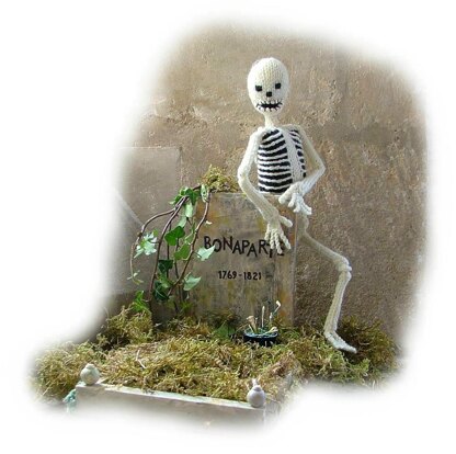 Bonaparte is knitted in DK yarn. (A smaller version(Lazybones) is also included in this pattern knitted in 4 ply) Bonaparte measures 30cm tall when completed and Lazybones 23cm. Lazybones is just the right size to hang in your car or on your computer. The joints are moveable including his jawbone and  his head turns from side to side.He even has a fibula bone!  An easy pattern with lots of illustrations to help.