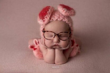 The main portion of this cute little bonnet is knitted. I use a basic crochet stitch to outline the ears. You can use pink and red to give the appearance of the professional photo above for ‘A Christmas Story’ photo prop. Or, you can you use any other color combination of your choice.