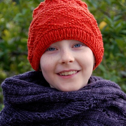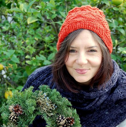 I wanted to create a hat with a flattish “sunburst” top and bands of pattern. I used the classic design of the Sirupsnitter (diamond shaped cookies from Norway), set out for the festivities of Winter, along with a small XO for good measure, and topped with a sunburst, to keep your head warm! This hat is knit in the round with cables and textured sts. This hat looks best knit in a solid or tonal Worsted weight yarn. The height of the hat is easily changed by adding or subtracting the solid knit rows between the solid purl rows that separate the patterns. You may also like to add a large pom pom which would look cool, too! Large size is seen on each model.