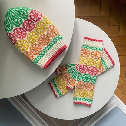 Small/medium sample is knit in Drops Flora and used the following quantities: Mitts: white 23g; orange 7g; pink/green/yellow 6g each. Hat: white 23g; pink/green 7g each; orange/yellow 4g each.