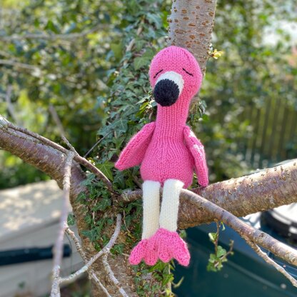Knit a bright pink Fancy Flamingo toy with sleepy eyes and big feet.