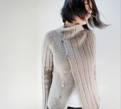 Construction: Sleeves are first knitted from cuff up and left on waste yarn to join body at underarm. Sweater body is knitted flat in one piece from bottom up. Lower body is designed with gentle flare. Short rows are used to create curved dropped hem for the back. Body and sleeves are joined at underarm. Sweater is knitted in one piece from underarm to top of neck with raglan style sleeves. Button loops are picked up using single crochet along the edge on the WS of Left front.