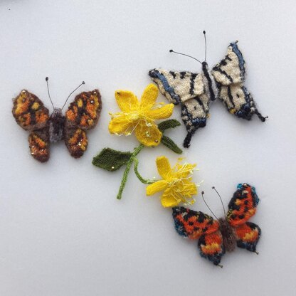 Included in this pattern are the Southern swallowtail, the large tortoiseshell and the wall brown and the flower St John’s wort. Each butterfly measures 5.5 cm and is an easy, fun and fast project to be finished in an evening or so. The 5.5 cm butterflies were knitted flat on 1.25 mm dpn in a lace-gauged yarn, but can be done in heavier yarn (and will turn out a little larger). The antennae ask for sewing yarn and hair spray/gel. The flower was done with i-cord knitting and loop stitches. A butterfly is also a great project to use up any scraps you have lying around and they can be attached to just about anything, as an embellishment. Or, start your own butterfly collection or lepidopterarium, as there are more patterns available!