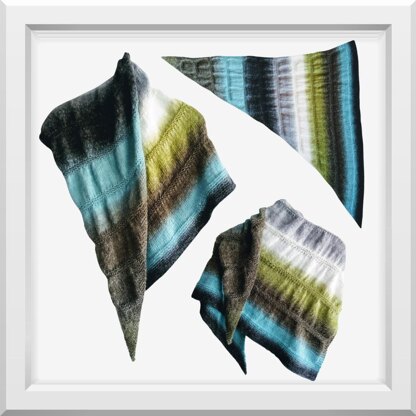 My sample shawl measures 170 x 80 cm. It was knit with a “long colour-changing” yarn & 5,5 mm needles.