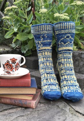 If I’m not knitting or engaging in some other fibre craft I can’t think of a better way to spend an afternoon than sitting down to read a good book. Tucked up in a comfy chair, book in hand, I am ridiculously happy. Add in an oversized cup of tea and a slice of cake and quite frankly I’m set for the whole afternoon. I designed these socks to celebrate just such an afternoon and marry it up with my love of stranded colour work.
