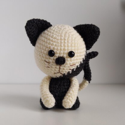 ✩ Size: the cat is approx. 4.25 inches tall. Materials: sport weight yarn in two colors (white and colored (red, black, blue)), I use Kartopu Gonca 300 mt 100 g; crochet hook 2.5 mm; yarn needle; fiberfill for stuffing; scissors; eyes, brown or black embroidery thread.