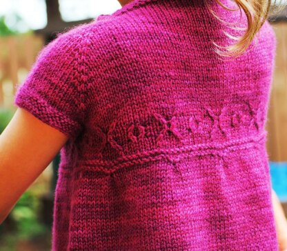 A short sleeved cardigan featuring a hugs and kisses motif around the chest, the bodice is fitted and the main body is flared. Cardigan has minimal finishing and is knit top down incorporating collar and button bands, with sleeves stitches held and finished after.