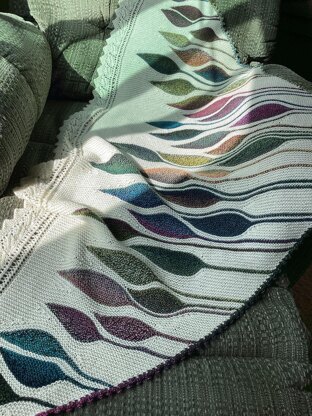A New Dance is a beefed version of my Dancing Leaves shawl pattern. Triangle shaped, lovely row of lacy leaves top edge. Wider and longer.