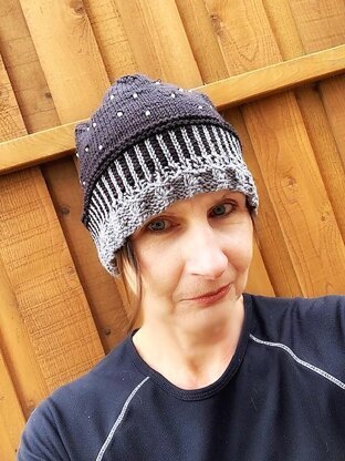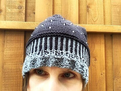 Knitted in the round in two contrasting colors. Starting with a pretty textured mock cable edge, next a two color rib pattern, followed by a pleasing sprinkling of stars in the form of beads. The hat ends with an option to have either lacy open decreases or a more tight, traditional one.