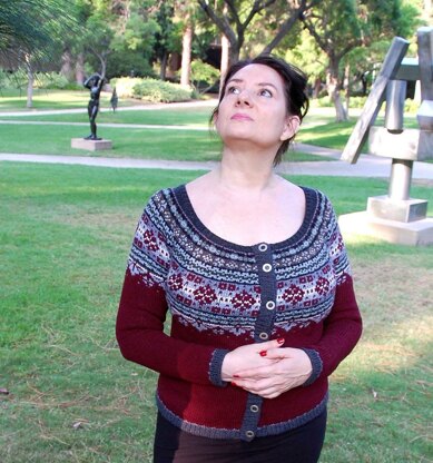 This is a pattern for a circular yoke cardigan worked from the top down and in the round. It is worked holding 6 strands of 2/28NM yarn from Colour Mart together to get a heavy DK - worsted weight yarn giving a st gauge of 22 sts. The cardigan is worked with a steek and you may work a straight or fitted waist option (both are included in the pattern).