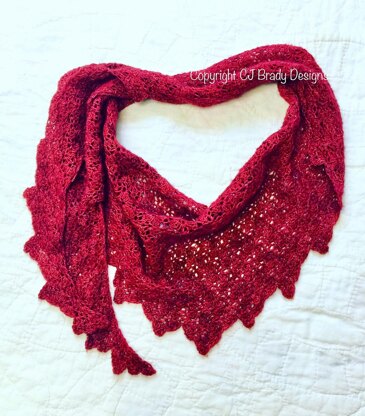 So, for Valentine’s Day 2019 I give you a lovely, romantic one-skein scarf, “A Thousand Kisses”. This light and airy scarf has a boomerang shape, with an easy, and very pretty stitch pattern.