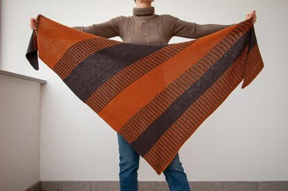 A Warm Place is a large, two-color triangular shawl knitted on the bias. Sections of garter stitch alternate with simple slip-stitch sections with a garter stitch background, making this shawl an easy and relaxing knit.