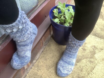 Brrrr, in colder weather its lovely to get outdoors for a walk, so long as you have the right clothing. Here are some beautiful socks in DK/8-ply yarn, with the heels, soles and toes worked with 2 strands of yarn held together. This results in super warm comfy feet and less darning! Do those little bobbles remind you of snowballs?