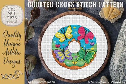 A YEAR OF DONUTS - APRIL!\nAll 12 monthly Donuts looks good enough to eat!\nSo much fun no matter how you use them! And even better, no calories! lol\nCross Stitch Patterns designed by Marcia Manning.\nEach month's Donut is the same size: 80 stitches wide by 80 stitches high.\nPDF is a COLOR counted cross stitch chart which lists suggested DMC floss colors, and includes a color picture.\nStitched design size is as follows: \n11 count: about 7.27" x 7.27"\n14 count: about 5.71" x 5.71"\n16 count: about 5.00" x 5.00"\n18 count: about 4.44" x 4.44"\n\nAdditional image shows October's Donut stitched on our matching BLANK. Image on the left as a coaster and image on the right as an insert into my "It's A Wrap" pillow wrap/wall hanging. Sewing pattern is available as well as the cross stitch blanks.