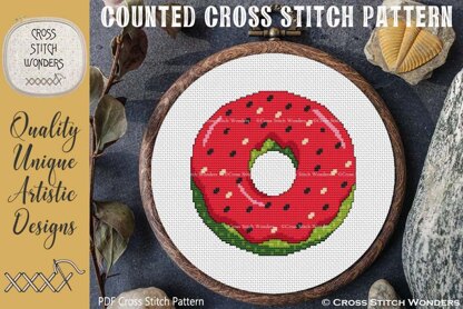 A YEAR OF DONUTS - AUGUST!\nAll 12 monthly Donuts looks good enough to eat!\nSo much fun no matter how you use them! And even better, no calories! lol\nCross Stitch Patterns designed by Marcia Manning.\nEach month's Donut is the same size: 80 stitches wide by 80 stitches high.\nPDF is a COLOR counted cross stitch chart which lists suggested DMC floss colors, and includes a color picture.\nStitched design size is as follows: \n11 count: about 7.27" x 7.27"\n14 count: about 5.71" x 5.71"\n16 count: about 5.00" x 5.00"\n18 count: about 4.44" x 4.44"\n\nAdditional image shows October's Donut stitched on our matching BLANK. Image on the left as a coaster and image on the right as an insert into my "It's A Wrap" pillow wrap/wall hanging. Sewing pattern is available as well as the cross stitch blanks.